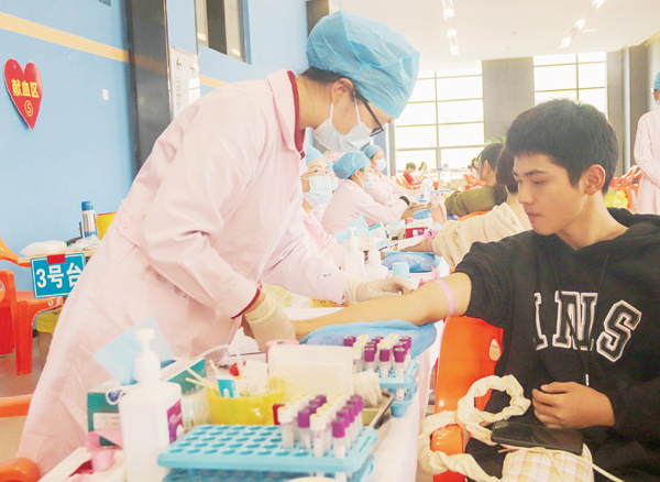 学生参加爱心献血活动。