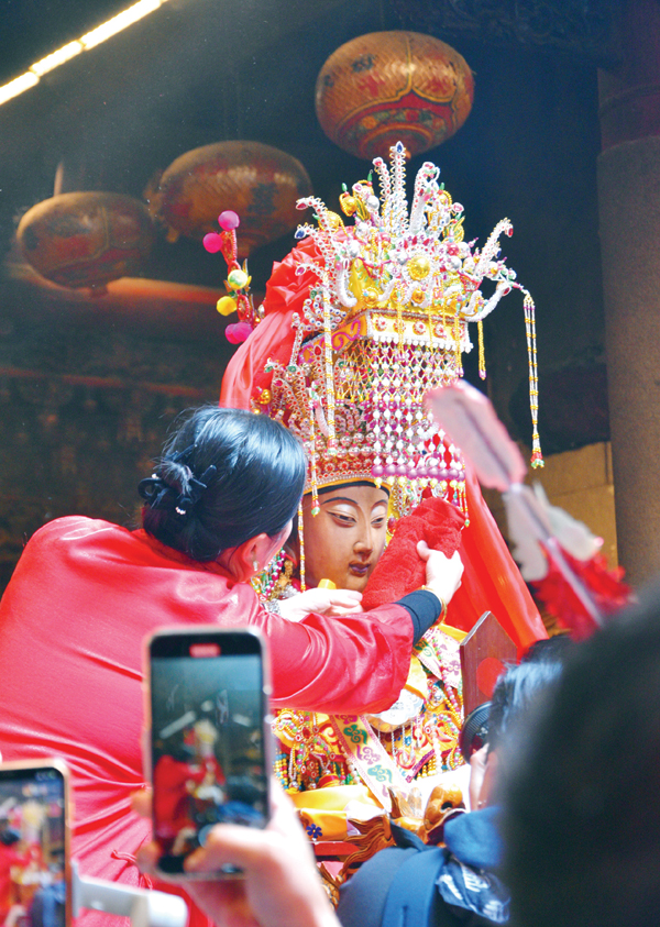 上午9时整,上林宫前广场锣鼓喧天,上林宫妈祖敬仰者身着盛装,恭送妈祖金身回銮祖庙。值得一提的是,回銮路上,上林宫护驾团与湖石宫的请香队伍正好相遇,两宫三位乩童斗阵,众人纷纷用手机记录下了这一幕。