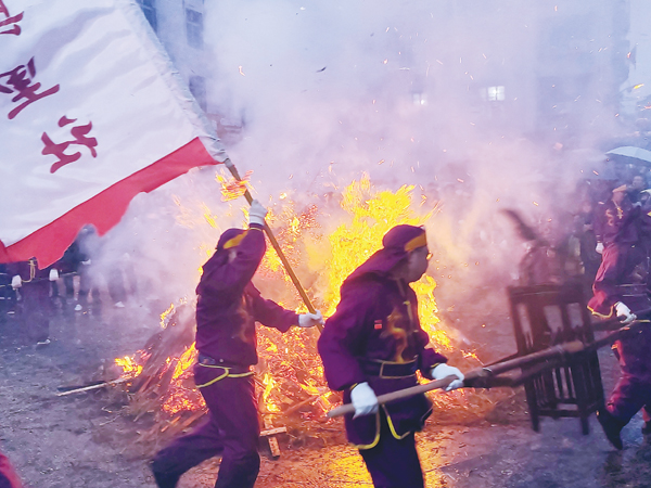 当日傍晚,巡境的踩街队伍返回沟东纠察庙稍事休整后,代表六个里社的旺火熊熊燃起……42架棕轿齐上阵,围绕着代表6个里社的6团火堆,小伙子们精神抖擞,扛起棕轿轮番上阵围绕各自里社的火垛开始摆棕轿表演。摆棕轿的小伙子激情四溢,焕发蓬勃活力,从燃起的熊熊篝火四角穿行,旋转手中的棕轿,循环“8”字型穿梭跳跃,周而复始……一时间,现场沸腾起来,欢呼声、呐喊声,震耳欲聋!一场酣畅淋漓、尽情挥洒的摆棕轿表演,引发心灵震撼,不失为一场精彩的视觉盛宴。