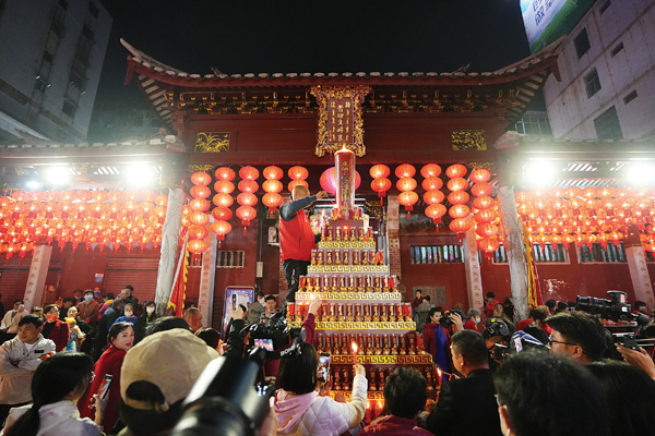 癸卯正月廿九,莆田文峰天后宫“尾暝灯”活动异彩纷呈,点火母、弄大仙、大五福、点烛山、妈祖供品展、民俗文艺踩街等让人目不暇接,上万妈祖敬仰者及游客同赏元宵、共祈平安、迎祥纳福。