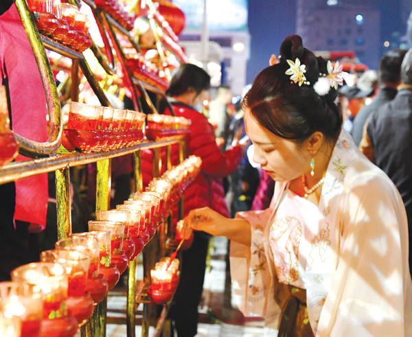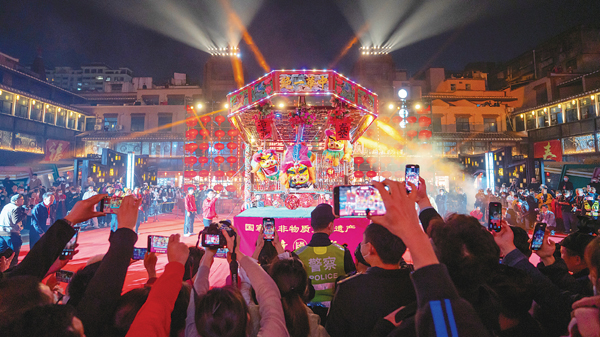 五福献瑞文峰宫,烛山祈福“尾暝灯”。华灯初上,文献路中段人山人海,人们引“火母”点烛山、点烛船,诚心祈愿新年红火安康。烛山蜡烛不能全点完,要留下二寸许“烛脚”,待到二月初一,各家各户再来请回他们的“烛脚”,带回家中继续点燃,寓意瑞兆临门、全年平安。当晚7时许,古谯楼前,莆仙戏剧院倾情演绎文峰宫非遗项目《大五福》,依次表演“天官赐福”“五子登科”“铁笔春秋”“毓麟瑞凤”“万宝朝宗”,福星、禄星、寿星、禧星、财星致贺赐福。