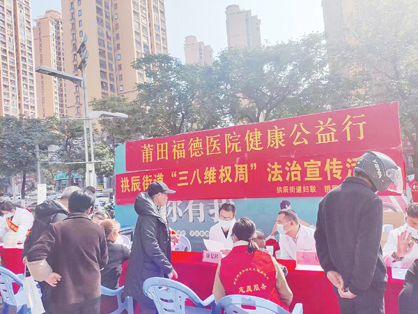 本报讯 免费义诊为群众健康解忧,送法下乡为百姓维权护航。3月5日上午,为庆祝第113个三八妇女节,荔城区拱辰街道计生协会联合卫健、宣教办、妇联、综治办、福德医院等单位在街道馨宜广场开展“关爱女性健康护航”公益义诊咨询和“三八维权周”法治宣传活动。通过结合工作岗位学雷锋活动,落实为民办实事、为群众送健康,倡导新型婚育文化,促家庭幸福和谐。