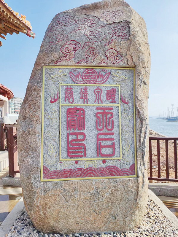 我还注意到,天妃广场一角,立着一方巨型“靖恭妈祖·天后龙印”,印玺周边自上而下配雕祥云、飞龙、三花、双喜、南天门、日月同辉、鱼跃龙门、海涌浪托,各有吉祥寓意,可见设计者的用心、细心、精心、深心。