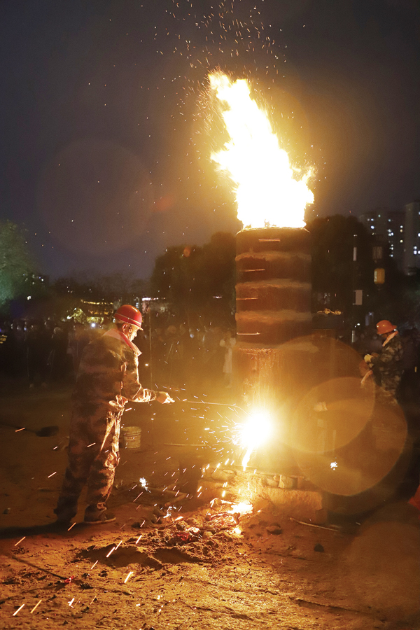 莆田“打铁花”元宵习俗,是省级非物质文化遗产,至今已有300多年的历史。据介绍,锦墩村村民原多以打铁铸鼎为业,老匠人们在冶炼铁具时,看到铁水溅到地上碰出火花而获得灵感,逐将剩余的铁水泼向大树,发现所碰撞出来的铁花甚为壮观,于是就运用到元宵民俗活动中,有“火树银花不夜天”的美誉。 (时报记者 翁志鹏)