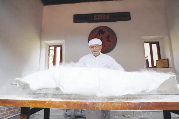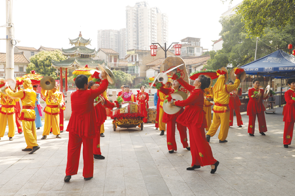 在萝苜田历史文化街区里,记者见到了涵江区的众多非遗项目,如涵江车鼓、错金银技艺、宝元福记燕皮制作技艺等。