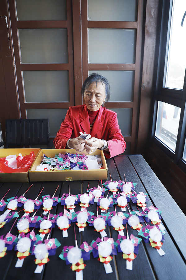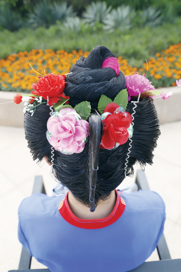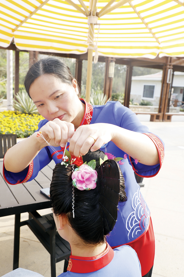 “帆船头、大海衫,红黑裤子寄平安”是湄洲女的传统形象。帆船造型的湄洲女发髻与大海衫、红黑裤子并列为湄洲女服饰的三大显著特征,此发髻相传为妈祖生前亲自设计。妈祖一生未嫁,将身心许于大海,独创的发髻是妈祖短暂一生中“帆髻示志”的象征。“髻为帆、针为锭、线为缆”,湄洲女发髻中各个配饰都有着独特的寓意。在船帆式的发髻中,髻代表帆,银针代表锚,红头绳代表缆绳,波浪形的发夹代表船桨,寓意“妈祖保佑四海万民一帆风顺”。