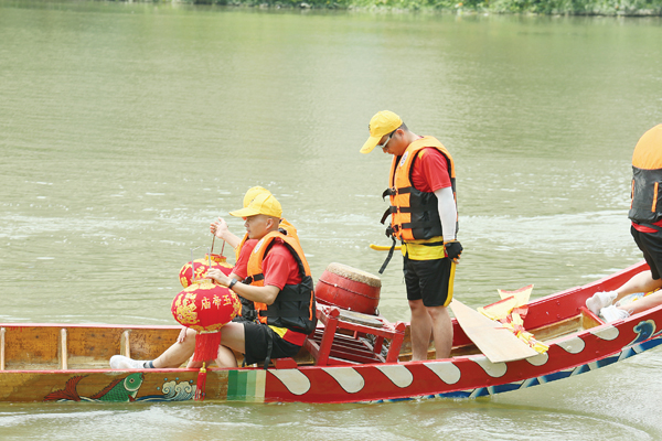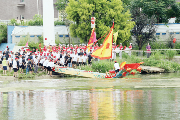 上午11时许,参加本次祭江仪式的贺船在众人的抬举下缓缓入水,大家挥臂划桨,和着锣鼓的节拍划向虎啸潭戚继光纪念馆附近集结。