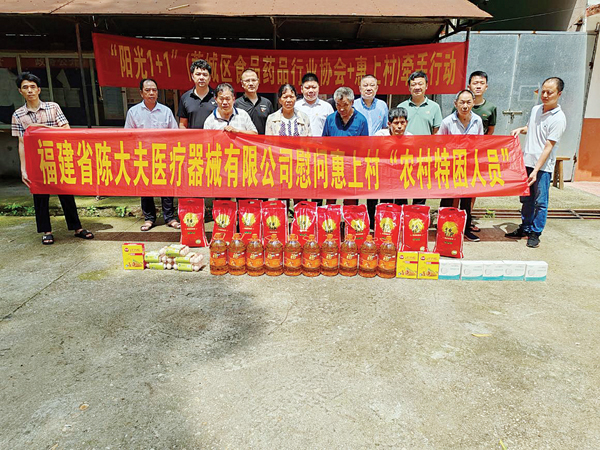 省级党员诚信示范企业、莆田市宁德商会常务副会长、荔城区食品药品行业协会副会长、福建省陈大夫医疗器械有限公司董事长陈忠兴给五位农村特困人员送去了慰问金、大米、花生油、鸡蛋、棕子、口罩等,并吩咐他们要注意个人卫生、做好防护措施,增强信心、自强自立,过上安康的生活。