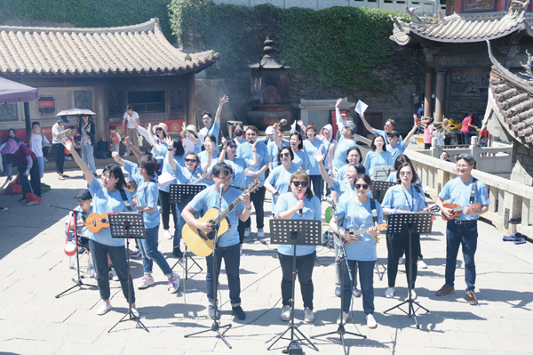 7月2日上午10时,尤克里里轻快的旋律在祖庙天后宫前广场响起。《童声妈祖》《听妈妈的话》《爱拼才会赢》……歌曲一首接着一首,杨妍蓁等人用充满热情的歌声演绎着他们对妈祖的敬仰,欢快的现场气氛和耳熟能详的旋律吸引众多香客、游人驻足拍摄。