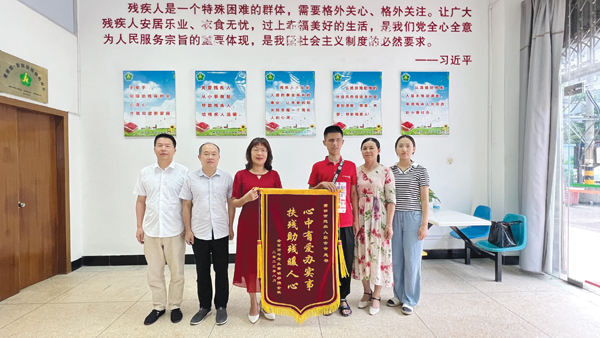 本报讯 8月18日,城厢区2023年应届高考学生黄镇宇和母亲一行来到莆田市残联,将一面印有“心中有爱办实事 扶残助残暖人心”的感谢锦旗亲自送到市残联陈念禧理事长的手中,表达他们的感激之情。