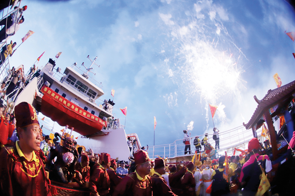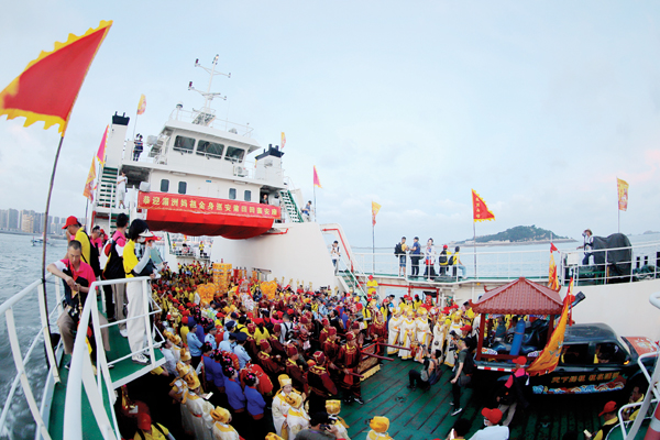 当天18时许,湄洲妈祖金身抵达湄洲岛码头。道路两旁,来自海峡两岸近万名妈祖文化敬仰者自发肃立等待,恭迎湄洲妈祖金身回銮。