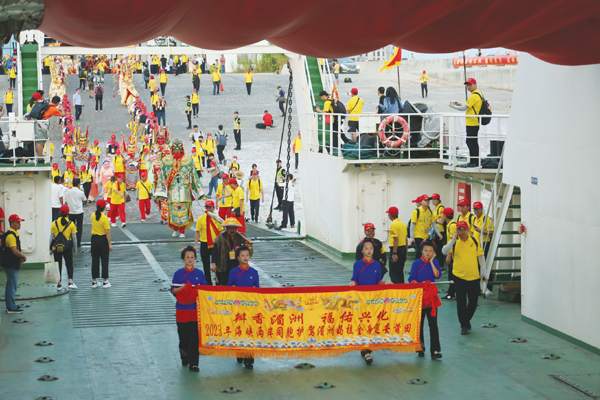 由10多家台湾妈祖宫庙共同参与打造的妈祖文化主题彩车,500余名台湾同胞参与护驾成为此次巡安活动的亮点。绵延数里的队伍中,除了湄洲妈祖祖庙传统仪仗队和莆田、汕头等地民俗队伍外,还有台湾地区的报马仔、哨角队、花鼓阵、千顺将军、醒狮团等80余人民俗阵头参与其中,进一步密切两岸同胞情感沟通,呈现两岸民间文化交流融合新气象。