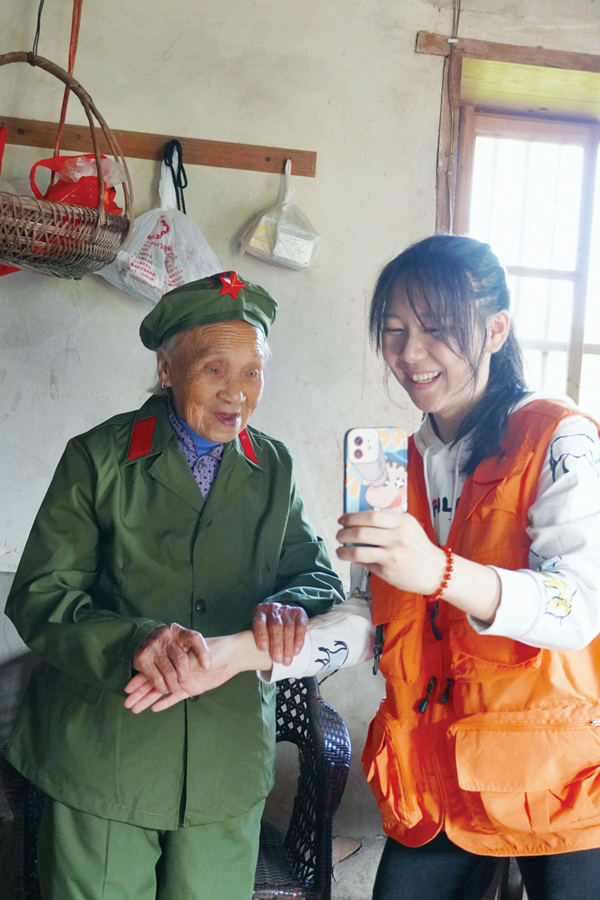 高阳村洧潭139号住着乡里年纪最大的老接头户林楼顶妹。楼顶妹15岁时受苏华、黄国璋、林汝楠等革命家的影响,不顾同村人劝阻,做好会付出生命代价的准备,毅然加入了抗日游击队伍,做起了接头工作。她需要花费三四个小时翻山越岭前往青溪运送粮食、服装等物资,还需要克服敌人的重重阻碍来传递情报,并和家人一起护送驻村的地下党员返回接头地点。在战火纷飞的年代,她经历了无数的艰难险阻。但是老人在回忆往事时眼里却带着光。也是在这里,小分队队员们看到了令人感动的一幕:老人换上军装,笑容洋溢,微仰着头,罕见的蓝色瞳孔闪耀着对红色的最真挚的爱。
