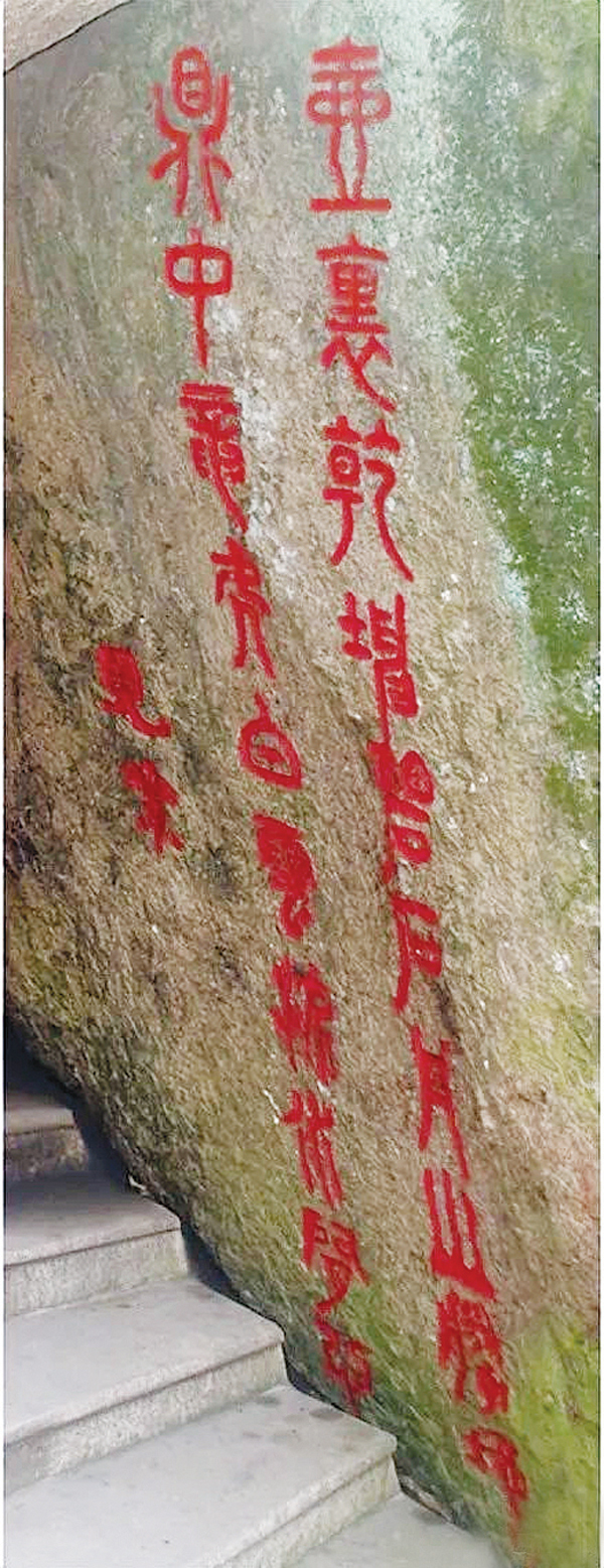 九鲤湖九真观去往玉帝楼的石阶小路旁的九仙祠西侧有一副对联,其联曰“壶里乾坤碧石丹山胜地;鼎中龟虎白云流水闲心——见素”,此题刻为竖式,古篆,字径15厘米。