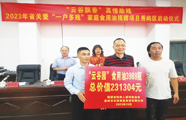 活动现场,爱心企业泉州市丰泽博昊商贸有限公司向秀屿区“一户多残”残疾人捐赠食用油3988瓶,总价值23万多元。莆田市残联党组书记、理事长陈念禧对企业的善举表示由衷的感谢。她表示这次的捐助活动不仅为我市残疾人提供了优质食用油,更体现了企业以实际行动践行公益初心和社会责任,弘扬全社会扶残助残新风尚,激发全社会关爱残疾人的生机活力,市残联将持续发挥桥梁纽带作用,继续弘扬大爱精神,进一步加强与爱心人士、企业的联动,鼓励更多的社会力量和爱心企业加入到我市的扶残助残事业中来,把满足残疾人的美好生活需要作为残疾人工作的根本出发点和落脚点,不断提升我市残疾人的获得感、幸福感、安全感。
