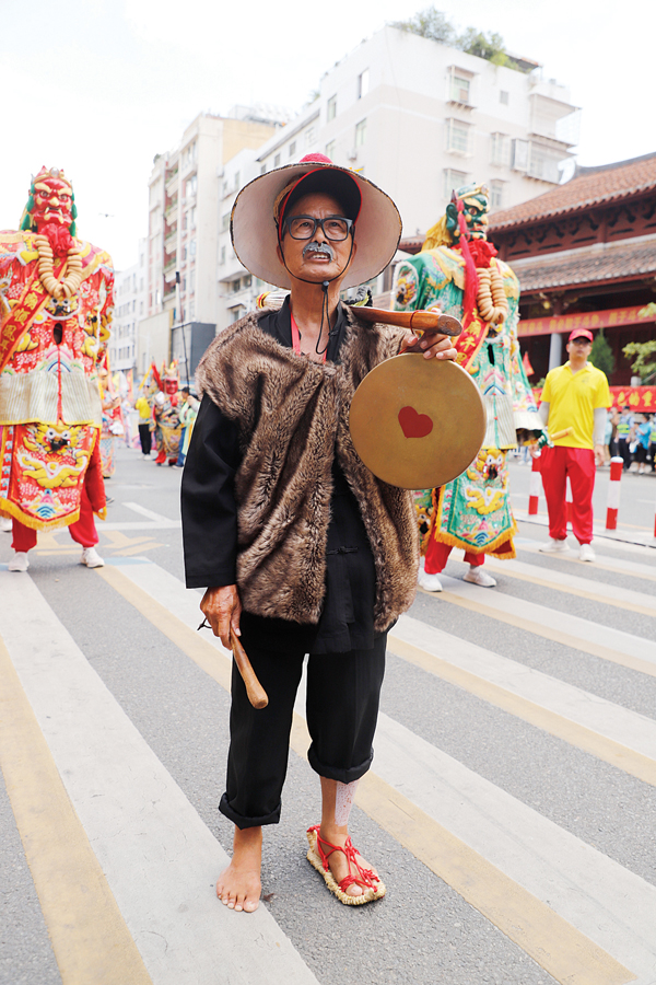 在巡安队伍中,一位身披黑衫、羊皮袄,一脚着草鞋,一脚赤足踏地的“报马仔”走在队伍前面,无疑是最耀眼的“星”。“虽然天气很热,一路下来也很辛苦,但能在妈祖故乡参加巡安活动,十分开心,这些辛苦都是值得的。”来自台湾,今年66岁的“报马仔”扮演者——易其山,微笑地告诉记者。