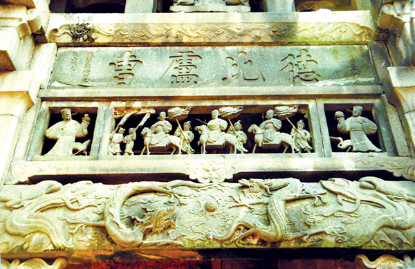 仙游大济的龙坂石坊,有200多年历史,是村内仅存的一座石坊。据了解,石坊建于清雍正年间,仿木阁楼式,四柱三间二楼,柱间距6.1米,通高9.2米。第一层阁中竖刻楷书“恩荣”,左右浮雕龙纹装饰,中间字牌横刻楷书“德比卢曹”。历经200多年,雕刻仍栩栩如生。 (陈国松)