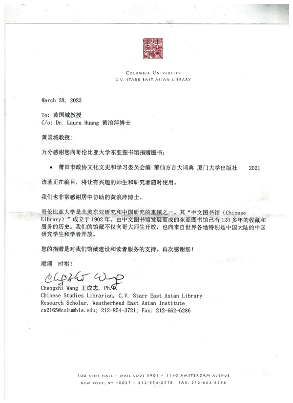 2018年4月,我和吴华英受仙游县政协邀请编写《仙游方言词汇》,作为仙游文史资料保存。整理和编写仙游方言要以仙游城关片的口音为准。我是郊尾枫亭片口音,吴华英是度尾西乡片口音,各自所收集的词汇不一定能与城关片的词汇完全相符,于是我便邀请城关片口音的林碧珠一同参加此项工作。编写期间,我们三人分住福州、厦门、莆田三地,因此只能以电话、微信和电脑互相沟通交流。其间,若吴华英提出来的词汇,得到林碧珠肯定,那这个词汇就定下来;若吴华英或我提出来的词汇,林碧珠予以否认,那提出来的这个词汇就要注明西乡片或枫亭片。在《莆仙方言大词典》编写中,我和吴华英分工仙游部分的词汇,在后期的修改订正阶段,我们三人与黄国城主编也是以电话互相沟通。2021年12月,《莆田方言大词典》正式出版。2023年3月,应美国哥伦比亚大学东亚图书馆请求,我们捐赠了一本《莆仙方言大词典》给对方,哥伦比亚大学东亚图书馆为此还寄来了一封感谢信。