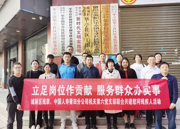 为深入学习贯彻党的二十大精神,弘扬社会主义核心价值观,有力推动“立足岗位作贡献 服务群众办实事”活动。11月21日,城厢区残联、中国人寿莆田分公司(以下简称“莆田国寿”)的党员志愿者们联合在莆田市城厢区华亭社区开展残疾人慰问活动,向华亭社区残友捐赠爱心物资,以实际行动支持残疾人事业发展,积极营造关爱残疾人氛围。
