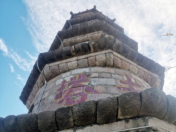 老人家每天都从山脚下徒步上山,他说要爬好几个小时。再爬上一段登山石阶,就到达塔山寺和寺后的望夫塔。