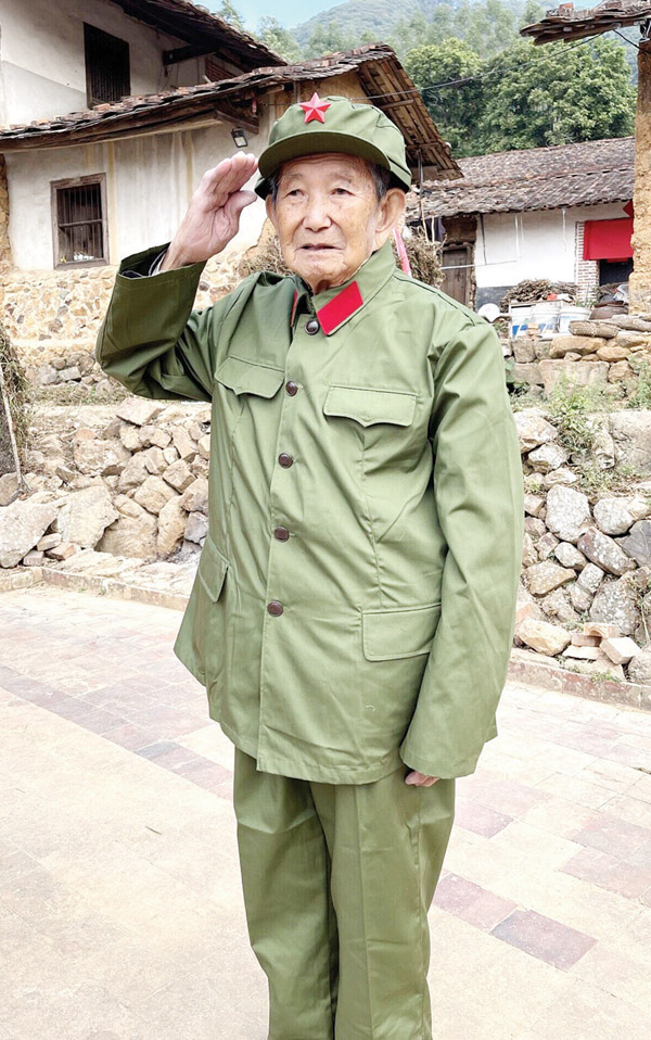 度尾镇圣山村94岁的老游击队员凌洪坤是“时光小分队”采访过的第一位在解放后参军过的革命“五老”。队员严舒晴深受感动地回忆道:“凌老虽然已离开部队整整70年,但当我们给他穿上军装的那一刻,他立即习惯性地挺起胸膛,举起右手敬了一个军礼,眼里满是欣喜和自豪!那一刻让我们深感所有的努力都是值得的。”