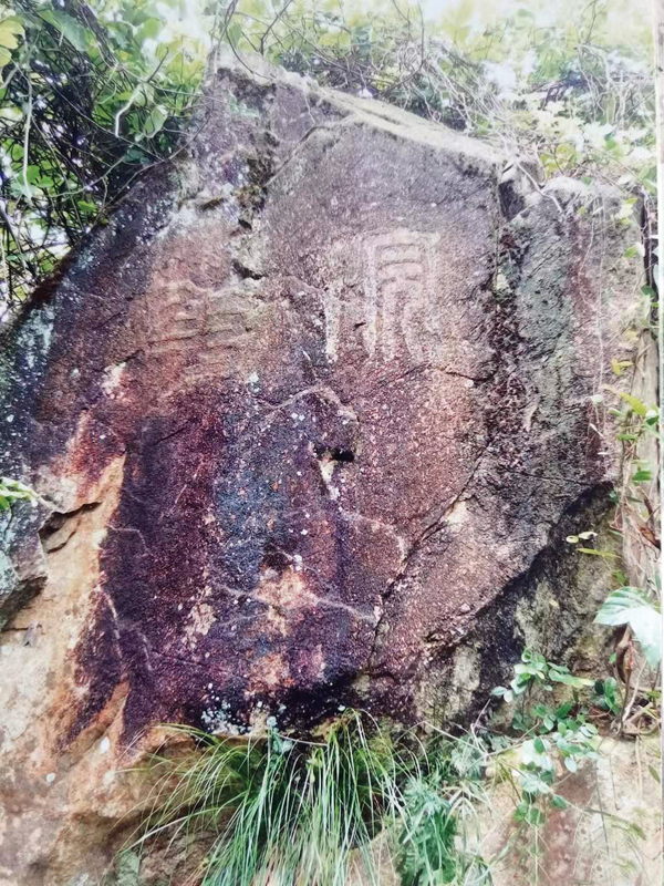 2023年7月3日,柯伯雄、柯美中、沈国钦三人来到新县村下仙井过去上面的寨埔山腰中,探寻几个小时才发现一块大石上刻一方明代天启七年(1627)正月的古崖刻,正中刻“杨后山”三大字,右左边刻小字落款“天启七年丁卯正月吉旦,大明孝男孙居、孙责、孙荣、孙禄泣立”。