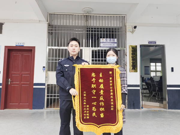 本报讯 12月7日,辖区群众詹女士将一枚印有“主动履责反诈担当 忠于职守一心为民”的烫金锦旗送到民警手里,感谢民警及时帮助止损,保护其财产安全。