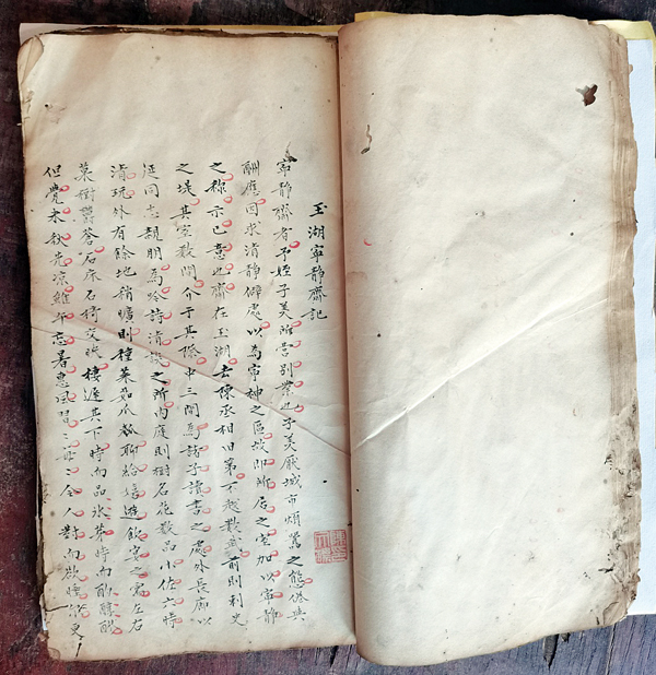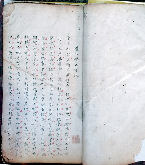 2020年7月31日下午,笔者随城厢区文联组织的“家园记忆”文化采风团一行来到东海镇蔡亭村,在山前133号陈荣土家看到一本其母亲保存的古本,系先祖陈文标于清康熙、雍正年间所著文集(手抄本,缺损)一本、诗集(破损严重,已不能翻动)一本以及陈文标及后人续编的《寿山陈氏家谱》一本,都非常珍贵,其中文集(手抄本)是研究莆仙主要景点及风土人情的重要史料。游记部分有《游紫霄岩记》《游狮峰岩记》《游石梯山寺记》《游鼓山涌泉寺记》《新九鲤仙宫记》《游石室记》《游城峰禅寺记》《如意松记》《游名峰岩记》《游麦斜岩记》《游西明禅寺记》《游城西叶亭记》《双寿承恩记》;记有《重兴水月庵记》《玉湖宁静斋记》《重兴占龙宫记》《名立户陈景南记》《列代祖茔记》《家世善事记》《紫图山祖茔记》等。此外还作有《祥禾颂》《请示禁赌呈词》《慎言训词》《遗训》《训子词》《慎终训词》《戒比匪训词》《笔铭》《墨铭》《砚铭》《杖铭》《镜铭》《改葬鸡山祖茔志铭》《牛山父茔志铭》《刘殿伯节母附葬祖母墓志铭》《观音亭叔茔志铭》等篇。