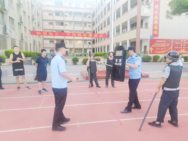 活动中,治安管理大队联合巡特警反恐大队、鲤城派出所组织私立一中最小应急单元和校园保安开展应急演练。详细讲解了防暴钢叉、防暴盾牌、警棍等常用防爆器械的功能和使用方法、技巧,以及实战运用需要注意的事项。