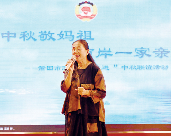 “一玉口中国,一瓦顶成家。都说国很大,其实一个家。一心装满国,一手撑起家。家是最小国,国是千万家。”“一个大门分两扇,进进出出一家人。一道海峡连两岸,世世代代一条根。”“等呀等几落冬,是我一生最大的愿望,大船大船货色载满满。”……市政协委员林雅丽、台商台胞张女士等共同深情演唱《国家》《两岸一家亲》《大船入港》等歌曲,用歌声表达“两岸一家亲,莆台亲上亲”的深厚情谊。