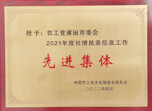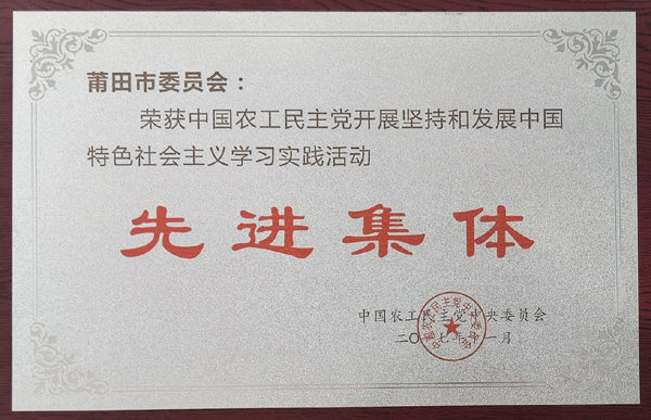 近年来,农工党莆田市委会被农工党中央授予开展坚持和发展中国特色社会主义学习实践活动先进集体、纪念中国农工民主党成立90周年先进集体、农工党脱贫攻坚工作先进集体、2018-2022年度先进集体组织,被农工党省委会、中共莆田市委统战部授予社情民意信息工作先进集体、社情民意信息工作先进单位等荣誉称号,充分彰显了履职为民的时代担当。