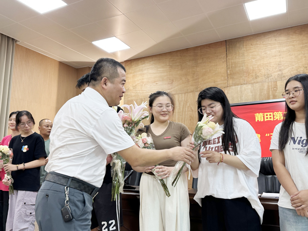 随后,在全师会议上,学校又精心安排了一场欢迎仪式。书记和校长为每位新入职教师赠送了校徽和精心准备的鲜花,再一次表达了对新教师们的热烈欢迎和诚挚祝福。鲜花的鲜艳与芬芳,为整个会议增添了浓厚的喜庆氛围,也寓意着新教师们将在未来的工作中绽放光彩,为学校内涵提升年的发展贡献青春力量,开始他们在学校的崭新旅程。