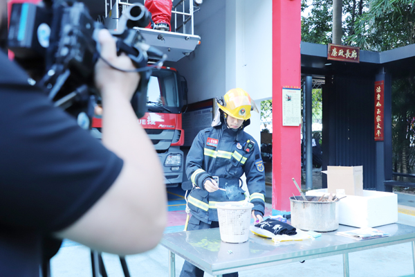 当下秋冬季节,枯枝落叶随处可见。消防员将一支未熄灭的烟头放进装满落叶枯枝的不锈钢桶,模拟户外随意丢弃的烟头不慎卷入干枯的草木堆中,很快就有缕缕白烟冒出。大约1分半钟,烟头附近的落叶出现成片阴燃。3分钟后落叶堆上方出现明火,开始猛烈燃烧。