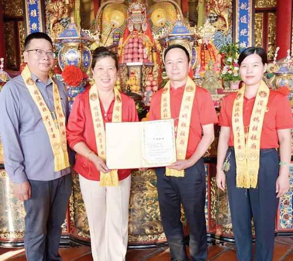林金辉说:“2023年9月,湄洲妈祖金身巡安莆田期间,我们便着手准备福宫灯事宜,最后选了用铜铸胎金掐丝珐琅工艺制作的景泰蓝妈祖福宫灯,今天我们把景泰蓝妈祖福宫灯献给妈祖。能为祖庙妈祖文化传播事业贡献自己的一份力量,我感到非常荣幸。”