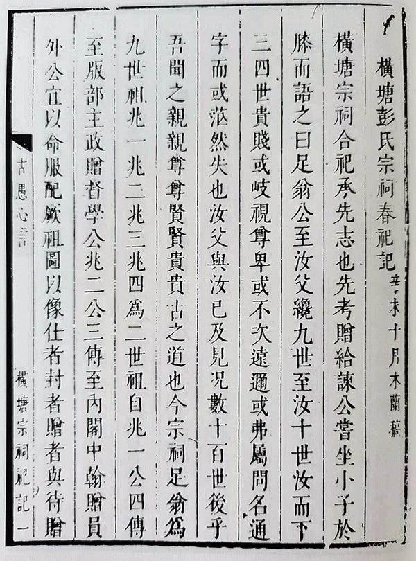 另据清代康熙朝横塘彭鹏(今黄石七境钱塘自然村人)重修祠堂,石门额题刻“横塘彭氏宗祠”,而不用“小横塘彭氏宗祠”,详见横塘彭鹏所著《古愚心言》载《重修横塘彭氏族谱序(壬申木兰稿)》一文摘录:“……横塘肇基,自足翁公始。……十世孙鹏重修《横塘族谱》,特序此。”《横塘彭氏宗祠春祀记(辛未十月木兰稿)》一文摘录:“横塘宗祠合祀承先志也。……盖自吾(按:‘吾’指彭鹏)家以横塘为大宗,于义(房)则隘,鹏易祠额曰:‘彭氏宗祠’(全称:横塘彭氏宗祠)。”祠堂至今尚存,位于黄石七境钱塘自然村300号。