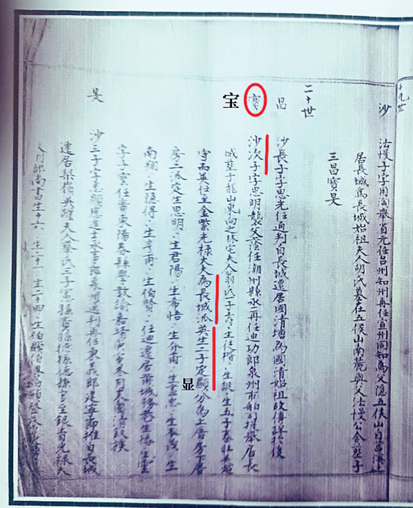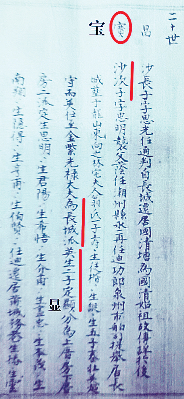 ▲沙公次子(林)宝,字思明,居长城,取翁氏,生一子:寿→从楷→诞→英(仕至金紫光禄大夫)为长城派。