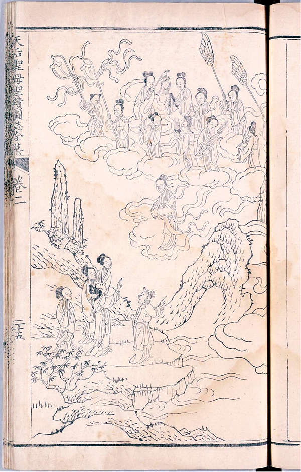 《天后圣母圣迹图志》“证仙班九日升天”,版画中左下部妈祖的姐妹们正在目送妈祖飞升,上部的云端众仙正准备迎接。隐隐约约中,钟鼓、丝竹、管弦齐鸣,演奏出各种美妙的乐声,侍女吹奏的神态活灵活现,具有强烈的舞动感,而立于云端的妈祖作拱手道别状。画面统一协调,采用白描的表现形式,刻画出妈祖别离亲人,白日飞升的情景。
