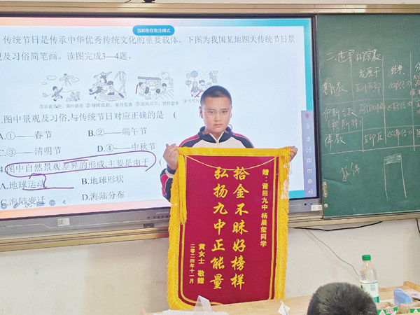 在收到遗失的手表电话后,失主黄女士特意定制了一面写有“拾金不昧好榜样,弘扬九中正能量”的锦旗来到了莆田九中,并在全班同学的见证下,通过班主任亲手赠予了杨晨玺,以表扬其拾金不昧的品德。