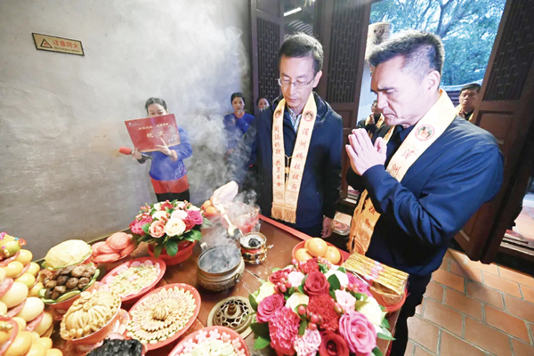 12月11日下午,台湾台中浩天宫重建主委王经绽一行人到达祖庙,湄洲妈祖祖庙董事会常务副秘书长朱金池陪同王经绽等人向妈祖行庄严的三献礼,并与众人参观圣父母祠,商议分灵圣父母像的具体流程。