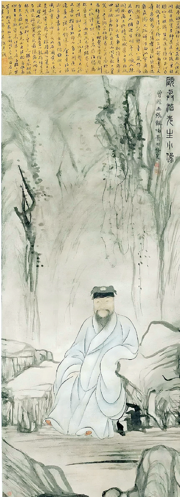 纵观此幅由曾、张、田氏三人合作的肖像画,图中山石景物出自明代画家张风之手,近于草书笔法率意抒写,放纵灵动的淡墨渲染与墨线勾勒山石轮廓,打破了传统肖像画的常规构图,而将人物置于画面中央稍下的位置,留出大量空白,使得画面具有动静结合的空灵感,生动地突出了南京名士顾梦游超然出尘、远离俗世和闭门隐居的文人韵致与个性特征。诚如,“……大风画无所师授,偶以己意为之,遂臻化境,潇然瞻远,几无墨路可寻,秣陵画家,掉臂孤行者,大风一人而已。……”据2008年6月杭州西泠印社出版社发行的清代周亮工《读画录》载:“张大风:名风(?-1662),字大风,号升州道士,又号上元老人,或署‘真香佛空’等,上元(今江苏南京)人,明末清初画家。擅画山水、人物、花卉,亦工肖像。早期风格较为恬静,晚年北游,笔墨变为瘦挺放纵。”而值得注意的是,该画轴装裱的诗堂上有李渔行书顾与治传记一篇,其内容是:“顾梦游,字与治,行二。其先吴县人。洪武间,徙巨族实京师遂居金陵。曾祖瑮,伯曾祖璘,皆成进士。瑮仕至河南副使,有清誉。璘仕至刑部尚书,以文章名。俱为金陵耆旧。祖峦,凤阳府教谕。父瑞祥,河南汝宁府通判。与治自少称神童,八岁作《荷花赋》,十九补诸生。明年食饩入棘闱。辄病,不终牍寝,厌举子业。好改诗词,四方士大夫争相推重。与莆田宋珏交好,珏死,自吴而闽走数千里,哭之。又乞钞宗伯谦益表其墓,桓死为梓其文传。已时曹公学佺选刻十二代诗士附以立名。与治独属故旧遗草,而不反已诗,强忧其个得一帙刻之,曰‘真诗也’,其声大振。又善行楷书,如静女高士闲逸,可逸喜。凡讠燕游饯送之会必有诗,诗必乞手书无少善贵赋雅俗之子,咸知重之所交友,如石斋黄公道周、芝麓龚公鼎孳、栎园周公亮工、无波徐氏元叹、震甫葛一龙、辟疆冒襄。与治交游图实,其交最深者以闽中林茂之、楚北杜于皇、上元张士风、桐城方尔止称知己,每见必出诗,相商改易。时壬午,予邂资来江东卜居,与治之昌晨夕相遇,为好无间。闽中曾波臣为与治画此小像,予其识其额。”该长篇跋文中不仅透露出顾梦游的仕宦家世和社会交往,还揭示其善于诗文与书法的审美追求,以及文人雅士的精神风貌。