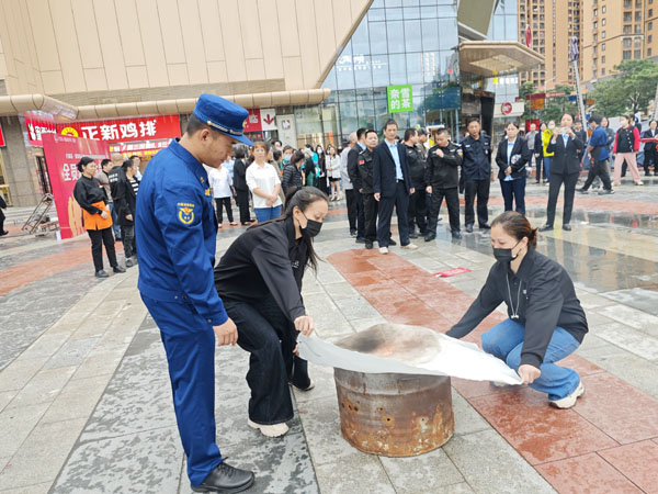 演练结束后,该大队宣讲员对商场内工作人员进行现场培训。从普及防火知识的角度出发,将防火、灭火、逃生、自救等方面的知识深入浅出地进行了讲解,重点讲解了火灾危险性及火灾的预防措施、火灾初期阶段的扑救方法等。随后工作人员们分组上阵,逐个亲自体验,现场进行了灭火器实操演练。大家态度严肃认真,严格按照灭火流程规范操作,随着一次次的“火起”、“火灭”,工作人员掌握了灭火器的正确使用方法,达到培训预期效果。
