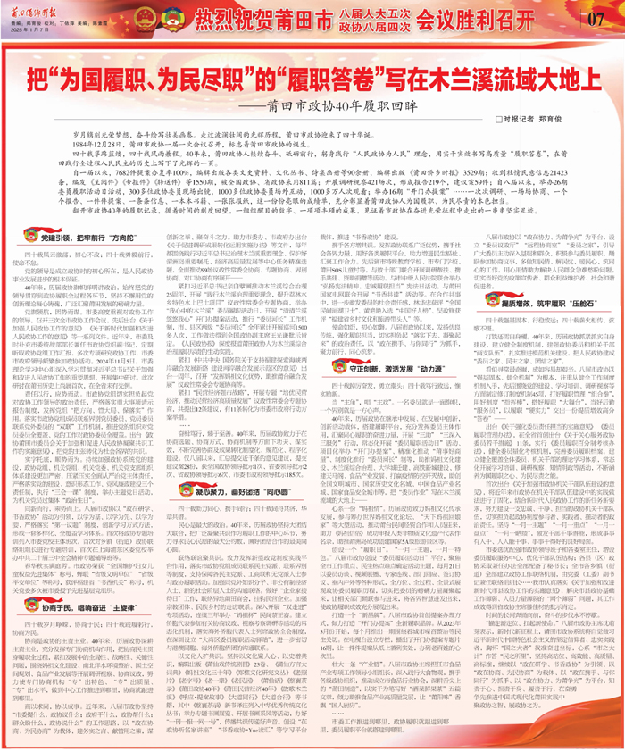 四十载筚路蓝缕,四十载风雨兼程。40年来,莆田政协人接续奋斗、砥砺前行,躬身践行“人民政协为人民”理念,用实干实效书写高质量“履职答卷”,在莆田践行全过程人民民主的历史上写下了光辉的一页。