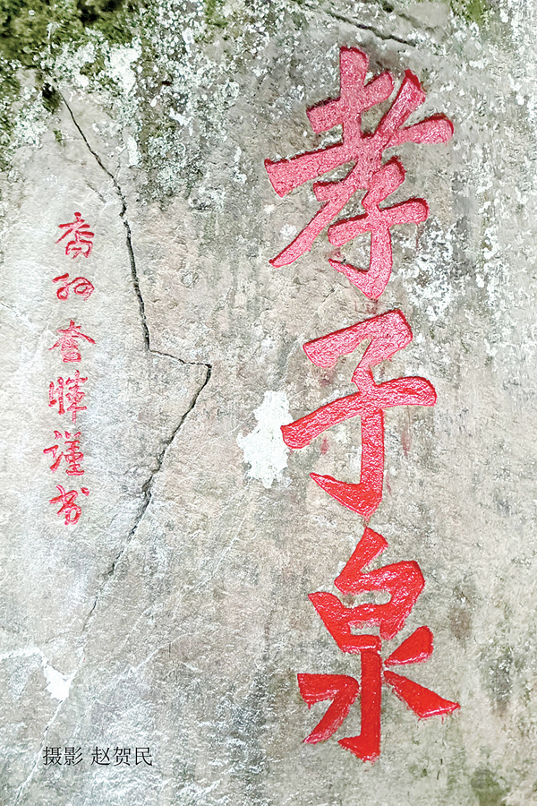近日,仙游县民间文保志愿者在菜溪岩风景区附近象山断崖上找到了被荒草藤蔓湮没多年的孝子泉石刻,他们动手将石刻周围的杂草剔除干净,尔后由书法家赵贺民先生恭恭敬敬地重新描上油漆,让这个脍炙人口的传说故事又开口说话了。