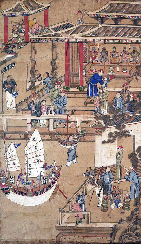 古画的上半部分描绘了五帝庙的景象:五帝神明端坐于神坛之上,目光威严中透露着慈祥;一名官员带着小孩,虔诚地跪拜在神明面前,祈求功名与未来;庙旁,乐队正在为送帝王爷船仪式演奏;庙前,男女老少各具情态,或刚踏入庙门,或三五成群地聊天,或倚靠栏杆观赏龙舟与凤船。整个画面生动地展现了人们的感恩之情,以及安居乐业的祥和气氛。