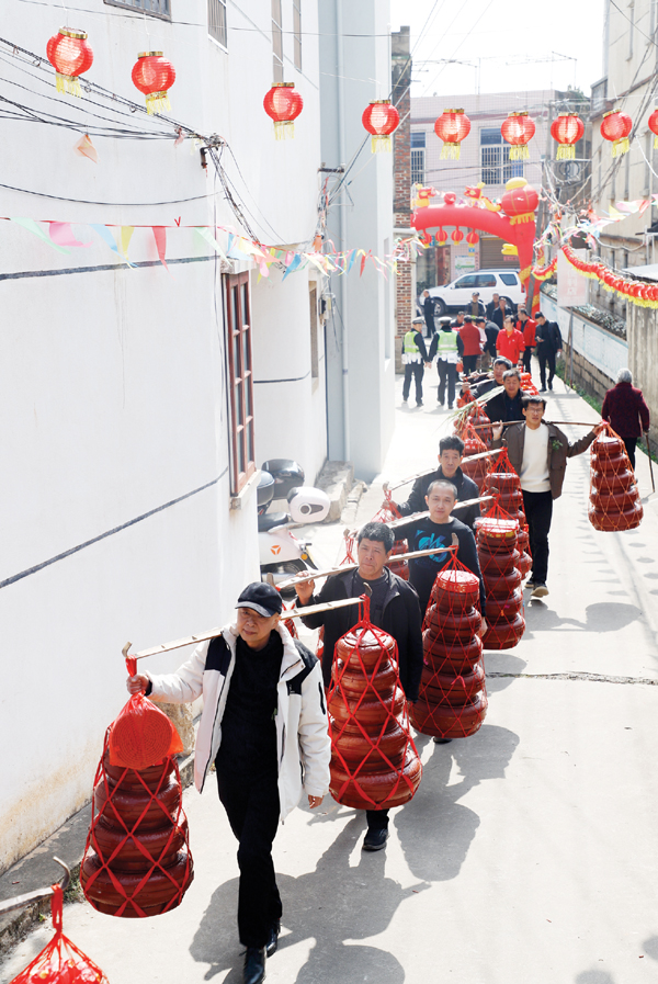 本报讯 2月4日,农历正月初七,涵江区三江口镇芳山村举行“千人千担挑万盘”闹元宵特色民俗活动。十盘担也称“红盘”,是莆田规格最高的贺礼,一担十盘,从大到小,荤素装盘,甘蔗随担,寓意十全十美、甜蜜和合。
