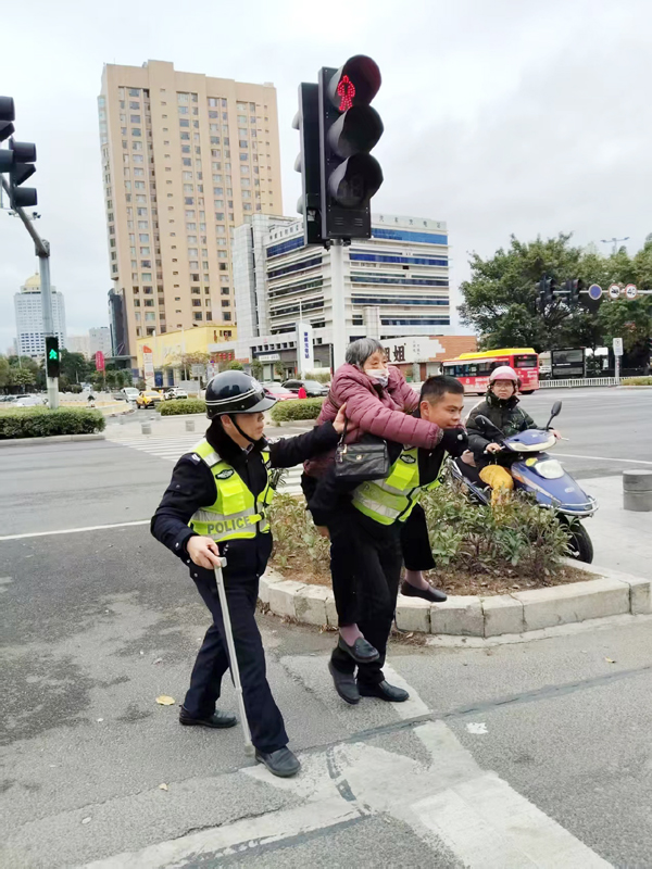 事发当天上午11时许,许华伟巡逻至城厢区商务大楼附近红绿灯处,发现一位脚步受伤的老人躺倒在地。当时车水马龙、行人不断、情况危急。许华伟迅速转移至人行道安全的地方,一边拨打120急救电话,一边联系老人家属。