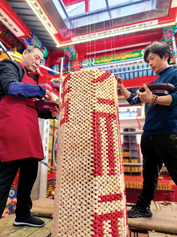 蔗塔由塔基、塔身、塔顶三部分构成,有4.2米高,整整365层,直抵天井顶部。塔基位于上下殿之间的大天井,上面放置着特制的带底托红漆八角形果盒,就像给蔗塔打了个稳稳的地基;塔顶是一块八角形木板,制作时作为参照,完成后成为顶端盖板,板上叠放着4个福桔,插着带有吉祥语花样的红色剪纸,还装饰着象征迎春纳福的“三春”纸扎。塔身是蔗塔的主体,全部由甘蔗节搭叠而成。从正月十三开始动工,搭叠过程极为讲究。师傅们选用190多公斤重且糖度高的新鲜甘蔗,削皮后切割成1.2厘米厚的圆形蔗节,部分还要染成红色。施工时,从塔顶顶板中间垂下千金坠与果盒中心相对,再用线将顶板八角与果盒八角相连,这九条线便是搭叠塔身的“定海神针”,如同泥瓦匠砌墙时的牵线。搭叠过程中还需错杂红色蔗节,增添喜庆氛围。这是个精细活儿,既考验技术,又需格外小心,师傅们经过三天的默契协作,才完成蔗塔的搭建。