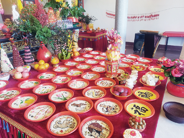 上午9时许,凤凰山文峰宫妈祖主殿的供桌上,除了摆放必备的鲜花、鲜果、馔品、六斋、茶、酒、十斋、五谷、饼筵、文筵、武筵等外,还增加了用大米、糯米、小米、大麦、小麦、豆类等拼接、粘合装饰成的“十二生肖”“二十四节气”“妈祖赐福”等艺术图形的52碟妈祖供品。这些妈祖供品寓意深刻、风格独特,融艺术性、知识性、观赏性为一体,具有浓郁的乡情习俗和鲜明的地域文化特色。主殿供桌前的左右两侧,各搭叠一座大型镂空状圆柱形的凤凰妈祖平安糕塔,造型高大美观,营造了神圣、瑞祥、平安、和谐的节庆氛围。凤凰山文峰宫董事长郑青青率董事会成员、中华妈祖湄女汇义工和妈祖敬仰者行三献礼,虔诚进谒,祈愿妈祖保佑风调雨顺,国泰民安。