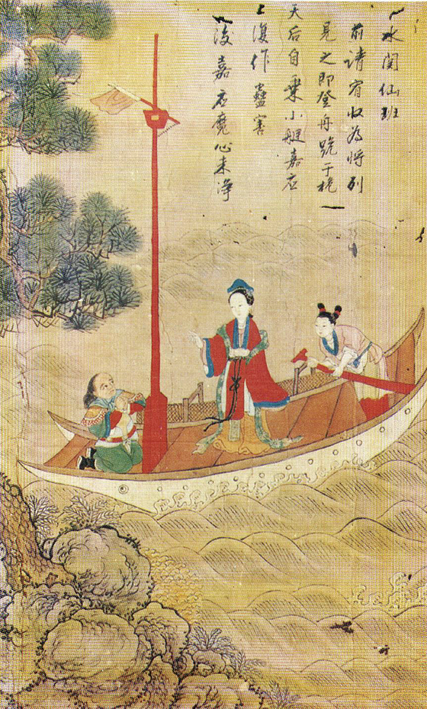清代欧峡《天后圣迹图》轴中“收伏二怪”画面,描绘妈祖手握拂尘立于船舶的尾部。据《天妃显圣录》“收伏二嘉”故事可知,前面有位绿衣模样的人即嘉应,正向妈祖作揖行礼。船头的水面上有个红衣将军模样的人即嘉佑。图像中的妈祖、船舶及布局等构思巧妙,不同身份与性格特征的人物形象和谐完整,并无局促之视觉空间感。清代大幅水陆画与中国国家博物馆收藏的《天后圣母事迹图志》“破魔道二嘉伏地”“净魔心乘舟显圣”画面、仙游枫塘宫《天后显圣故事图轴》“收伏二怪”等画面,在经营位置上均反映出简洁紧凑的章法,将人物和景物融合一体,多以自然山水为背景,营造出一种“道法自然”的叙事氛围。设色清新淡雅,趋于文人画之特色。用笔线条流畅,人物造型活泼,具有明清典型的仕女画风格特征,颇见南北方民间美术创作者的功力与修养。