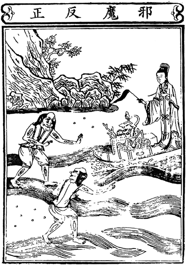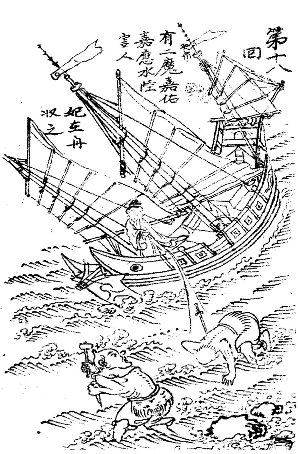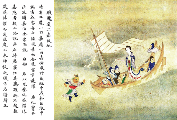 清道光六年《天后本传》中“邪魔反正”,描绘妈祖收伏嘉应、嘉佑二怪为其部将的故事。画面中二嘉同时出现在妈祖的船前,与收伏千里眼和顺风耳的场面近似。画面那些有节奏的波浪律动,暗示正邪双方正在进行较量,妈祖拂尘轻扬,邪魔即刻反正。该图中有题记:“……后大施法力,乃悔罪请宥,并收为将,列水阙仙班,共有一十八位。”